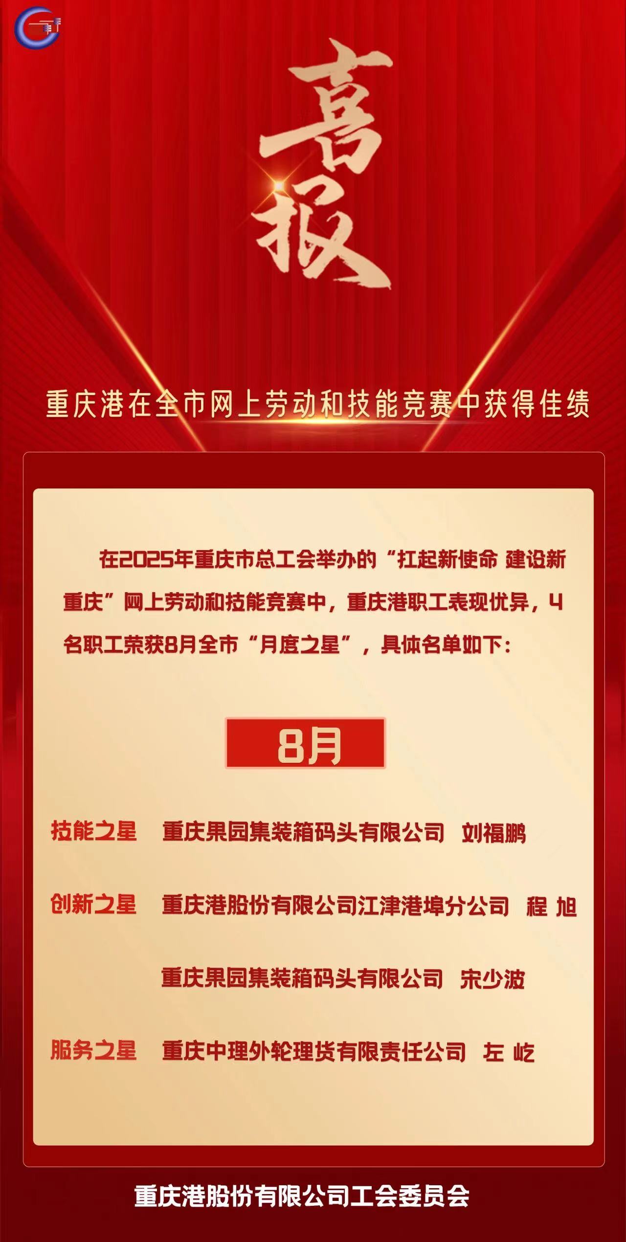 喜报!重庆港在全市8月网上劳动和技能竞赛中获得佳绩