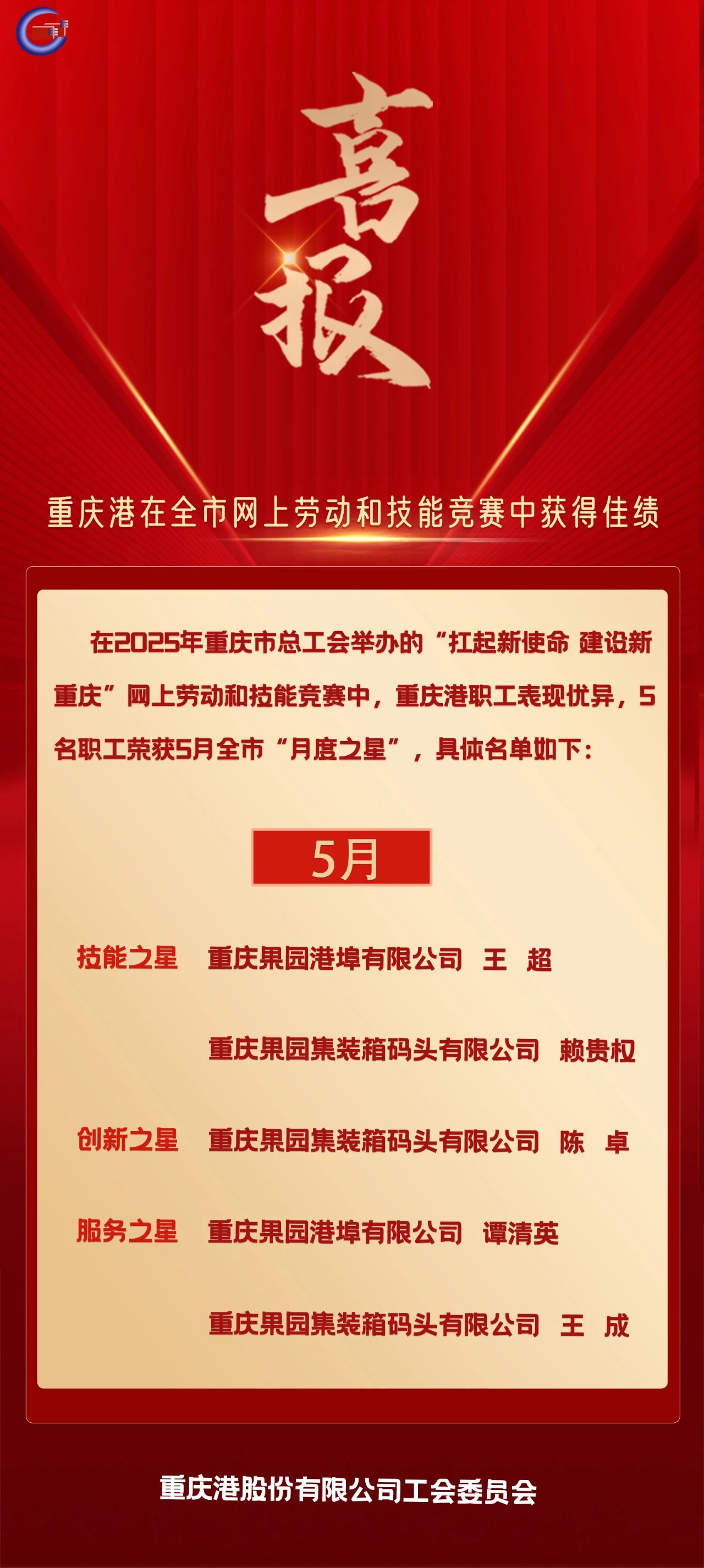 ?喜报!重庆港在全市5月网上劳动和技能竞赛中获得佳绩