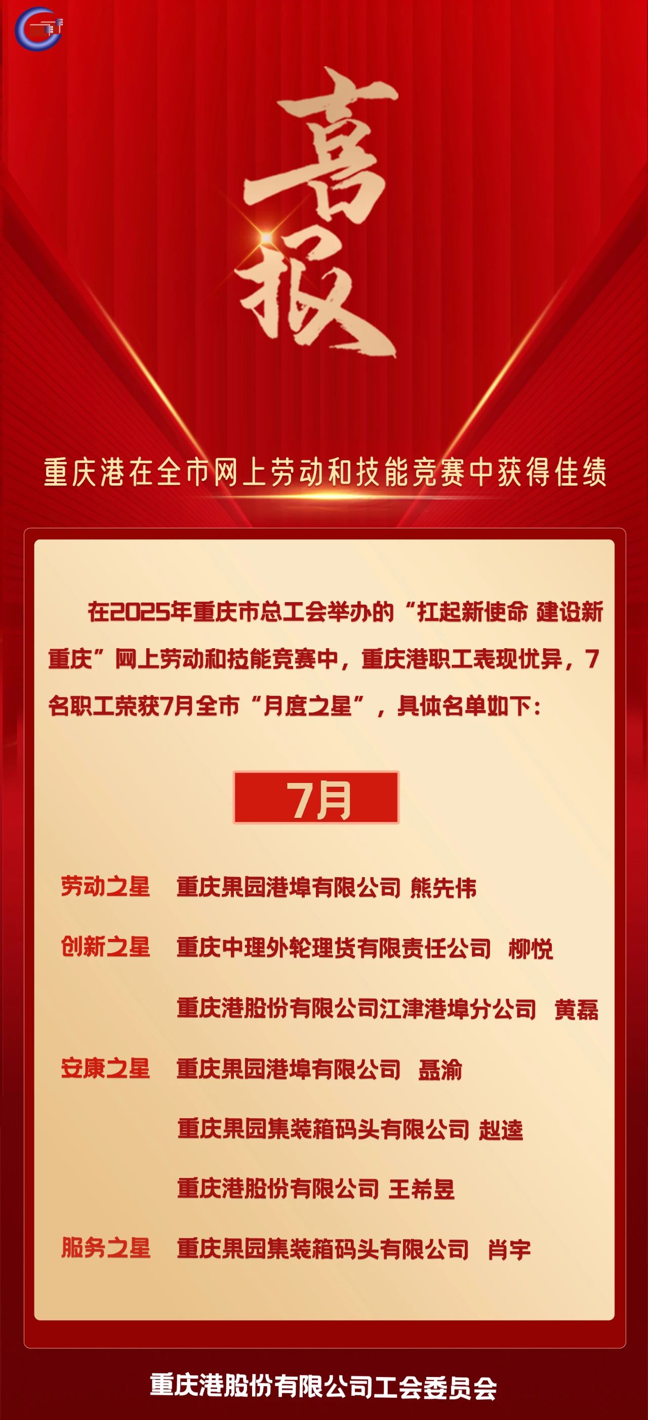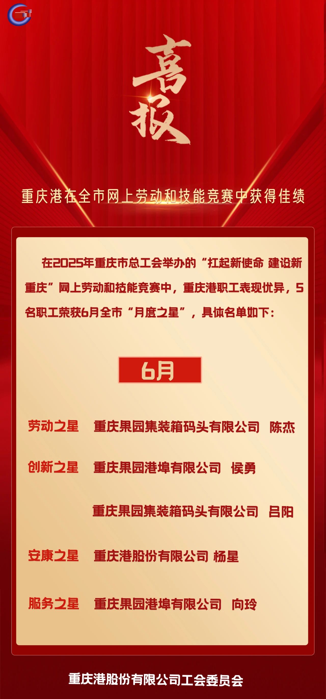 喜报!重庆港在全市6月网上劳动和技能竞赛中获得佳绩
